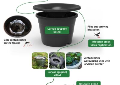 Unlike traditional mosquito treatments that rely on chemical spraying, the In2Care system works using a targeted approach. The treatment focuses only on mosquito breeding areas, which reduces the amount of chemicals introduced into the environment.